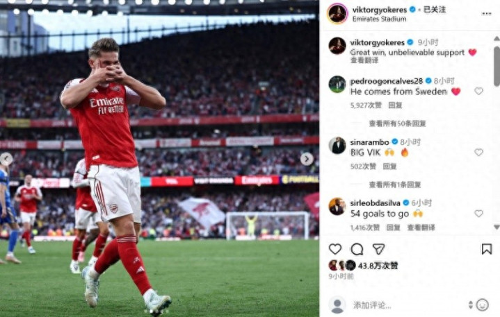 本场比赛阿森纳新援约克雷斯梅开二度,赛后他在个人社媒晒出标志性庆祝动作,配文写道:“漂亮的胜利!球迷们的支持难以置信!”
